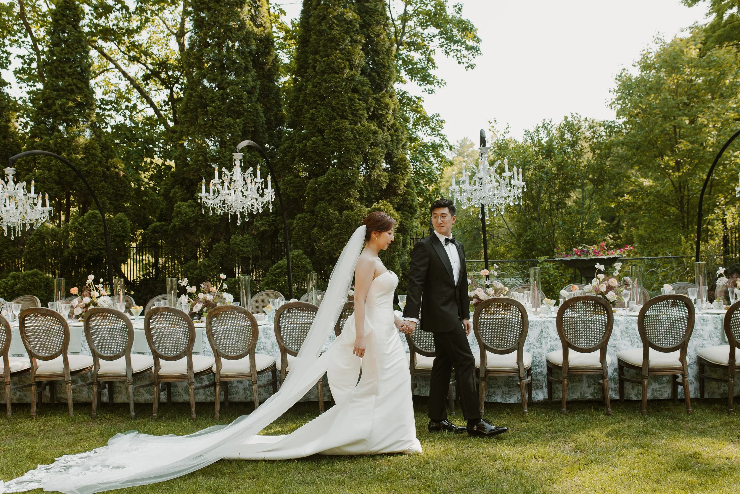 Guests gathered on the lawn for a heartfelt ceremony framed by lush greenery and a floral arch. As the evening unfolded, the celebration continued beneath glowing chandeliers suspended over long reception tables, creating a magical atmosphere for dinner, dancing, and a night of unforgettable moments.